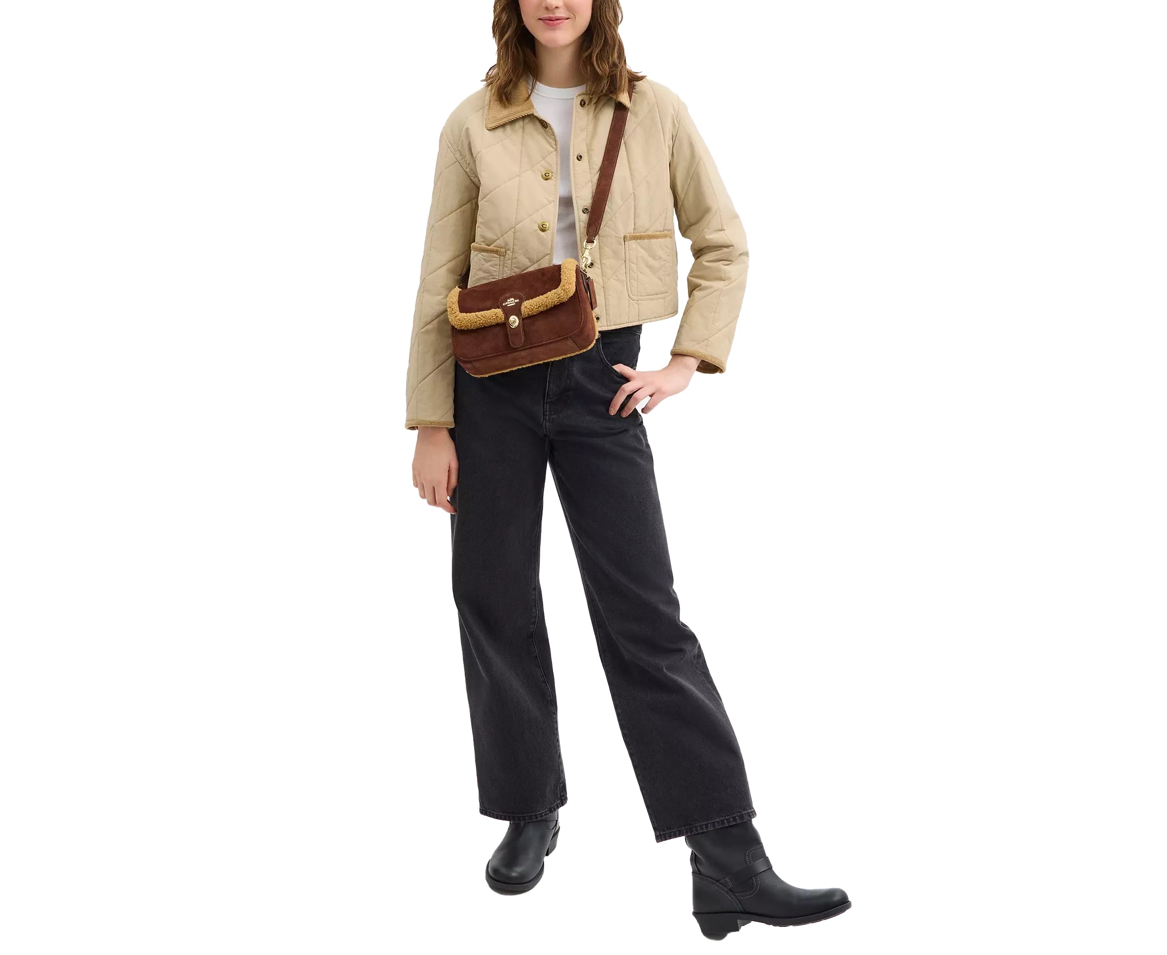 Sıcak dokusu ve sofistike tasarımıyla öne çıkan bu süet ve shearling omuz çantası, kış sezonu stiline lüks bir dokunuş katar. Süet yüzeyin zarif görünümü ile shearling detayların yumuşak ve sıcak hissi bir araya gelerek hem şık hem de konforlu bir kullanım sunar.
