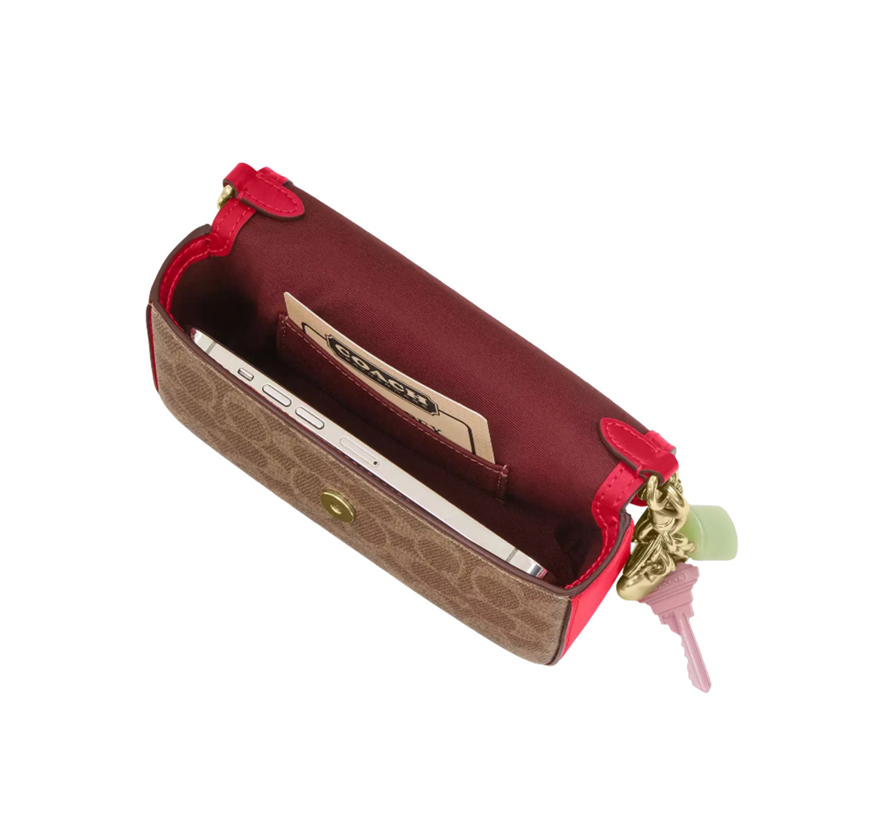 Zarafeti ve işlevselliği bir araya getiren bu kompakt çanta, sedef efektli Signature kaplamalı kanvas ve metalik crossgrain deri detaylarıyla göz alıcı bir parlaklık sunar. 17.8 × 10.2 × 5.1 cm ölçüleri ile minimal, şık ve taşınması son derece kolay bir formdadır.