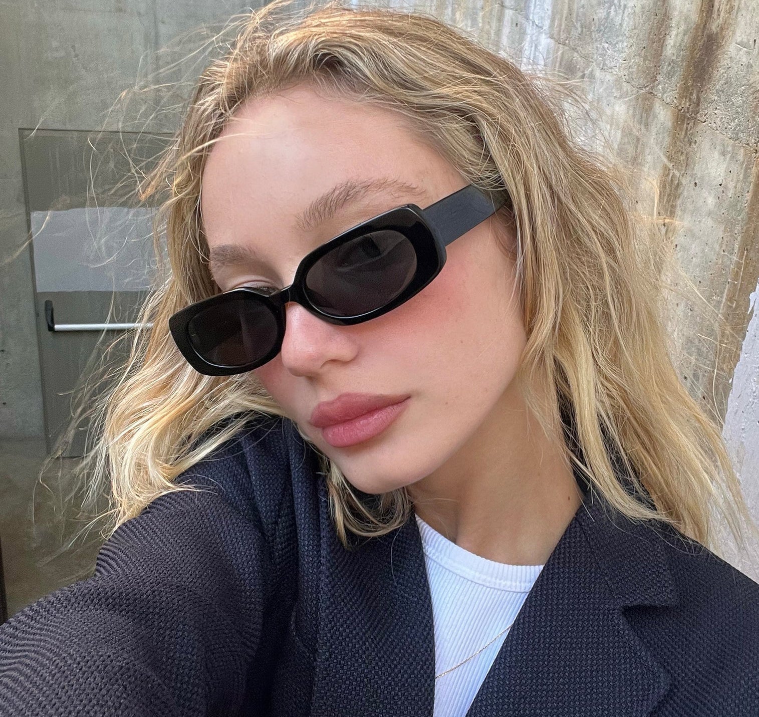 Olsen, ince dikdörtgen çerçeveli bir modeldir. Siyah asetat çerçeve ve dumanlı gri lens, her sezon takmaya değer bir parçadır.